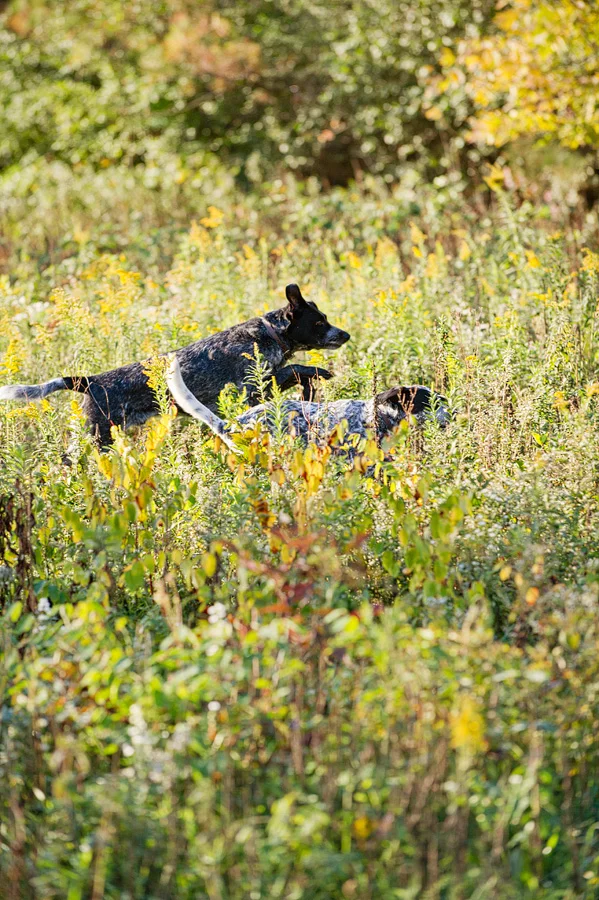 Gabby (light) and Eddie (dark) are 1/2 German Shorthair + 1/2 Blue Heeler. They were born 18 months apart to the same parents, making them kind of brother and sister.